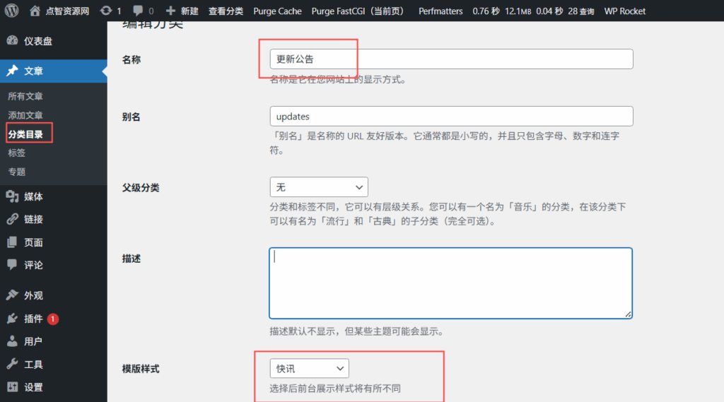 一样还是后台 —— 文章 —— 分类目录 —— 添加分类: