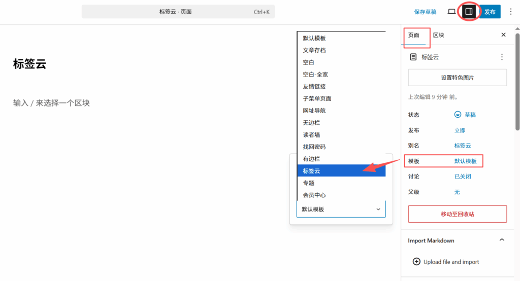 点开右上侧`设置` ——> `页面` ——> `模板` ——> 选择`标签云` ——> `发布`: