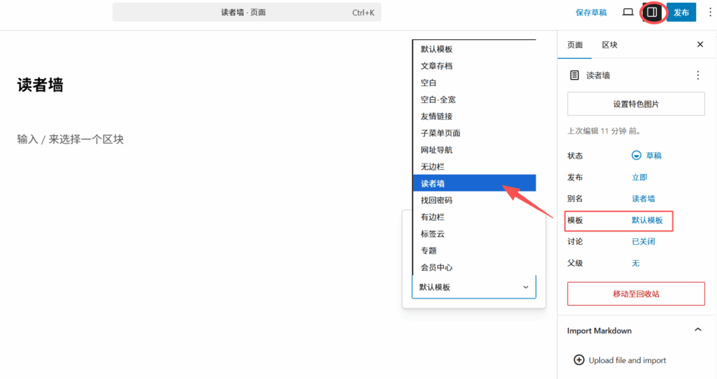 点开右上侧`设置` ——> `页面` ——> `模板` ——> 选择`读者墙` ——> `发布`: