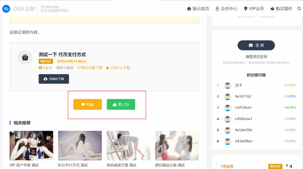 DUX 9.5主题与tb-member会员交易插件的文章点赞、文章收藏功能重叠了问题解决办法: