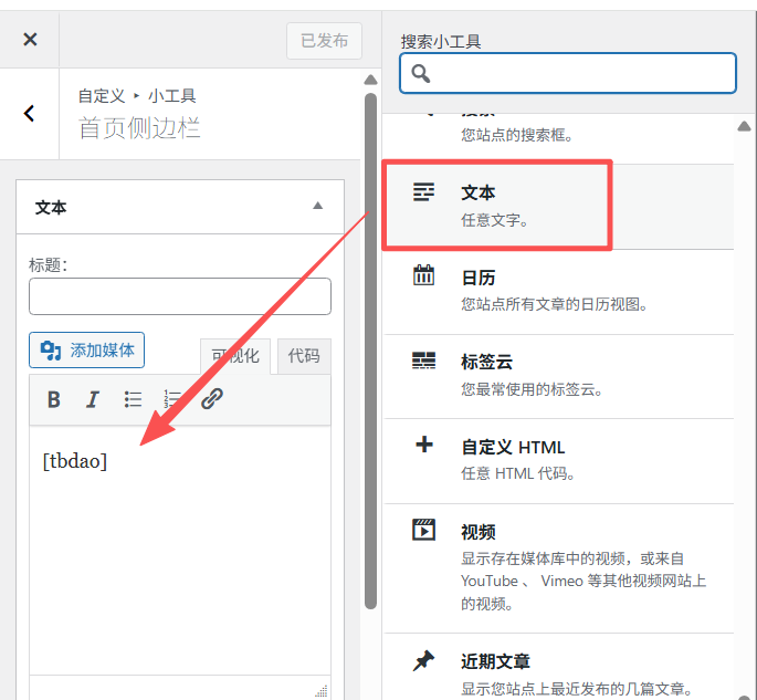 添加小工具 —— 选择“文本”,输入tb-member 会员插件的签到模块的简码:[[tbdao]][tbcontent login]