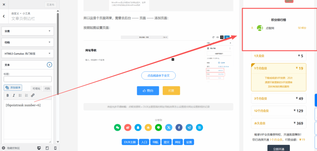 DUX 9.5主题在首页边栏或者分类侧边栏添加TB-Member 会员交易插件的每日签到功能、积分排行榜、开通VIP栏的方法记录: